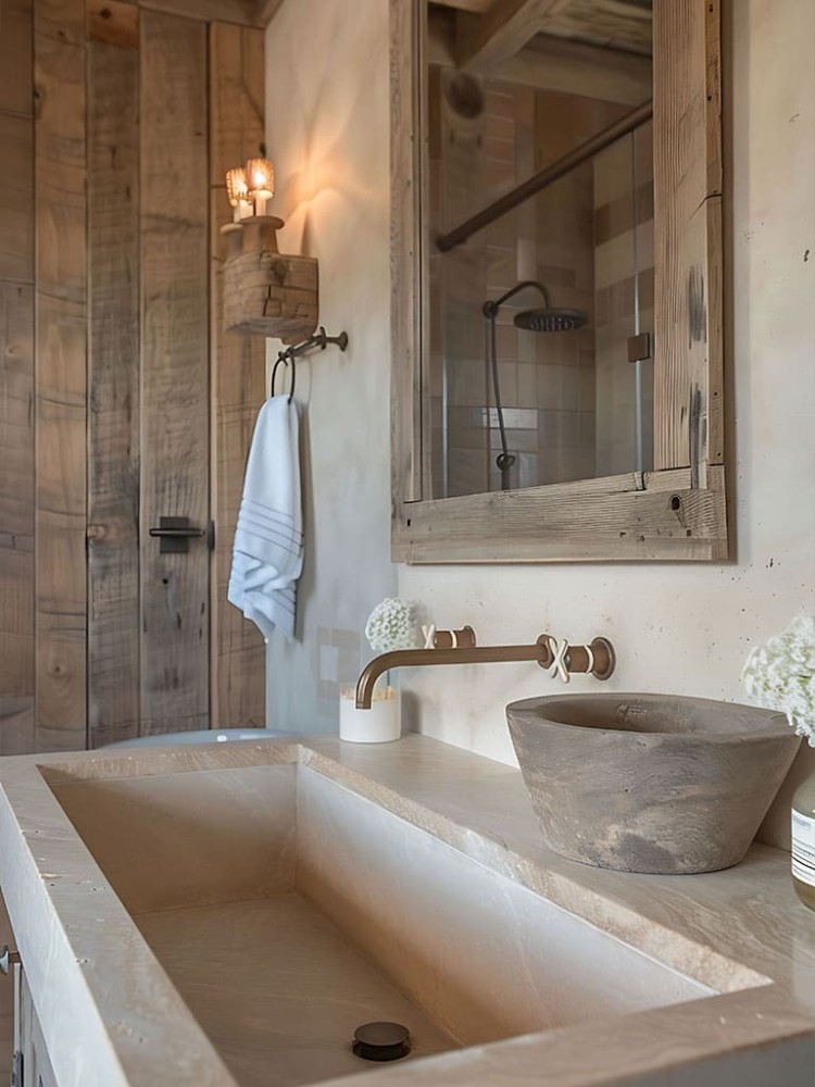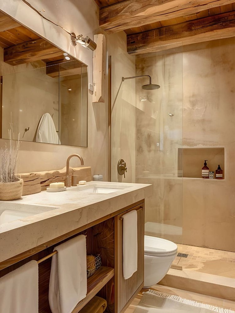 Porta nel tuo bagno un’atmosfera calda e accogliente, con materiali naturali e dettagli artigianali che raccontano storie di tradizione. Legno massello, pietra, travi a vista e finiture curate creano un ambiente che trasmette intimità e carattere, senza rinunciare al comfort moderno.